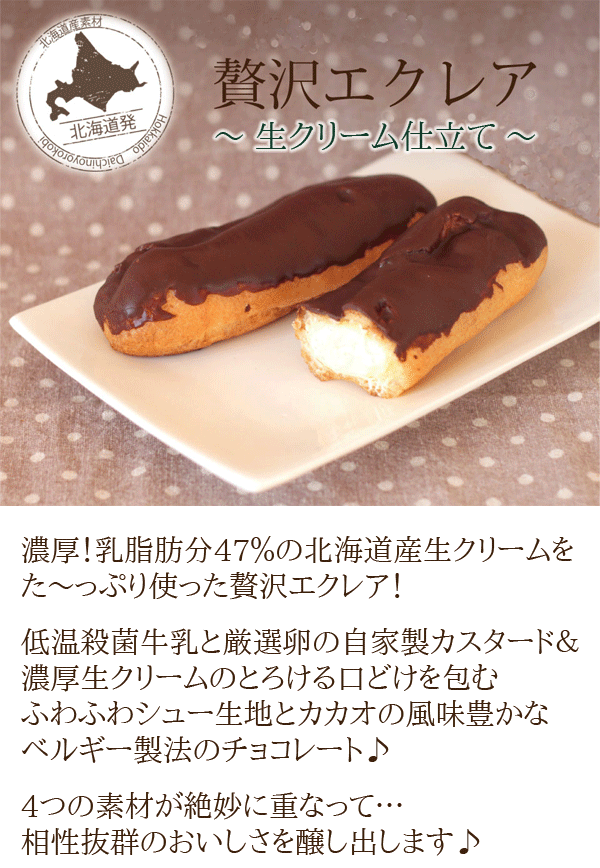 エクレア 北海道贅沢 エクレア (55g)エクレア 北海道贅沢エクレアはふわふわしっとりとしたやわらかい食感をお楽しみいただけます♪